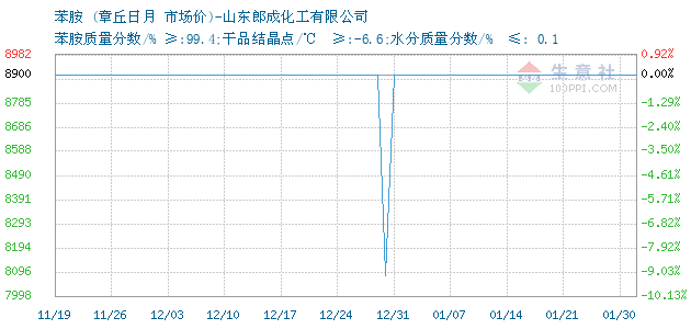 苯胺质量分数/% ≥:99.4;干品结晶点/℃ ≥:-6.6;水分质量分数/% ≤: 0.1