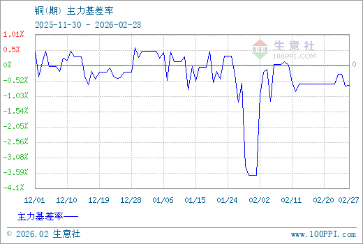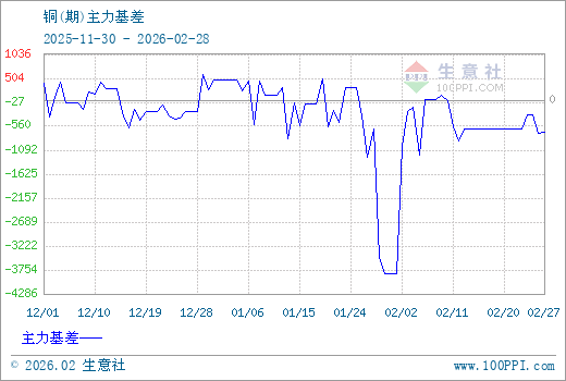 1、从2025-11-30 至 2026-02-28期间,铜主力基差最大值为593.33,最小值为-3843.33,平均值为-307.22。2、主力基差 = 现货价格 - 主力期货价格 = 主现期差。