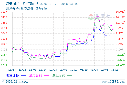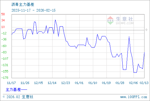 1、从2025-11-17 至 2026-02-15期间,石油沥青主力基差最大值为38.67,最小值为-159.00,平均值为-43.76。2、主力基差 = 现货价格 - 主力期货价格 = 主现期差。