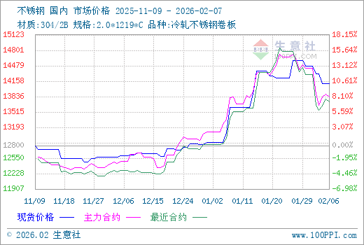 2月6日生意社不锈钢基准价为14100.00元/吨