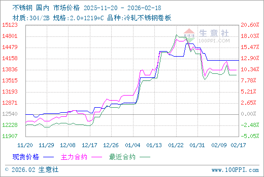2月17日生意社不锈钢基准价为14100.00元/吨