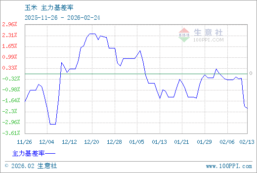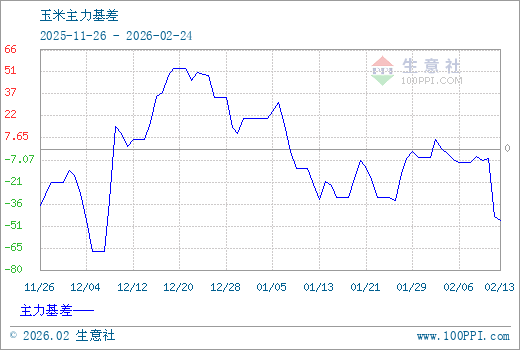 1、从2025-11-26 至 2026-02-24期间,玉米主力基差最大值为54.29,最小值为-68.43,平均值为-2.58。2、主力基差 = 现货价格 - 主力期货价格 = 主现期差。