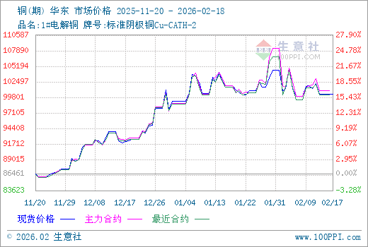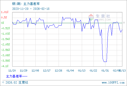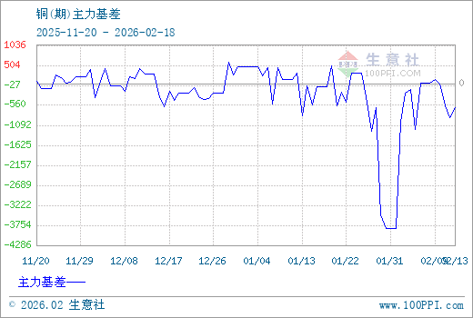 1、从2025-11-20 至 2026-02-18期间,铜主力基差最大值为593.33,最小值为-3843.33,平均值为-246.83。2、主力基差 = 现货价格 - 主力期货价格 = 主现期差。