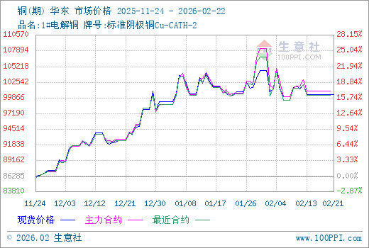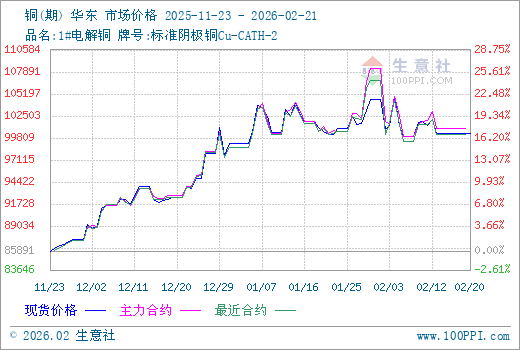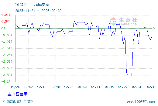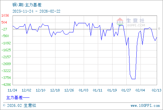 1、从2025-11-24 至 2026-02-22期间,铜主力基差最大值为593.33,最小值为-3843.33,平均值为-254.88。2、主力基差 = 现货价格 - 主力期货价格 = 主现期差。
