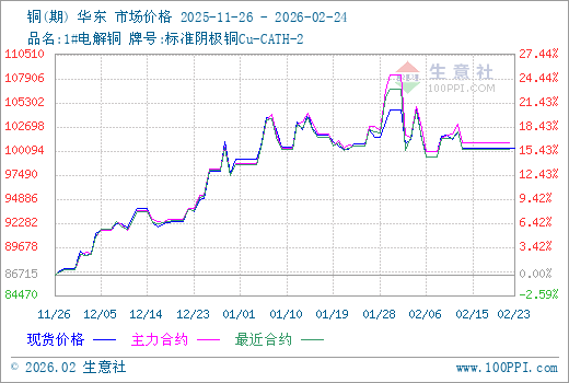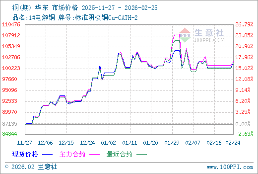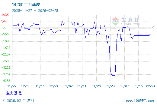 1、从2025-11-27 至 2026-02-25期间,铜主力基差最大值为593.33,最小值为-3843.33,平均值为-277.65。2、主力基差 = 现货价格 - 主力期货价格 = 主现期差。