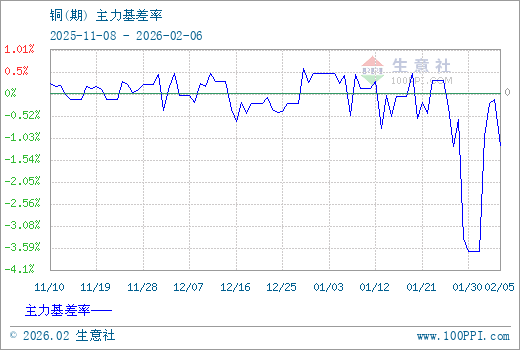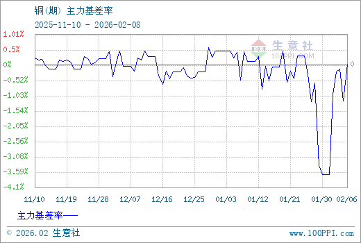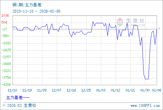 1、从2025-11-08 至 2026-02-06期间,铜主力基差最大值为593.33,最小值为-3843.33,平均值为-195.67。2、主力基差 = 现货价格 - 主力期货价格 = 主现期差。