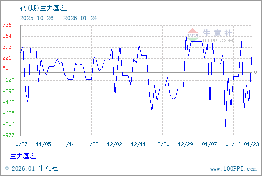 1、从2025-10-26 至 2026-01-24期间,铜主力基差最大值为593.33,最小值为-835.00,平均值为7.41。2、主力基差 = 现货价格 - 主力期货价格 = 主现期差。