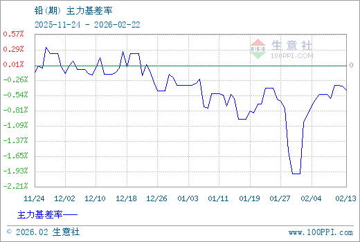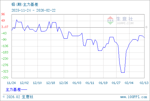 1、从2025-11-24 至 2026-02-22期间,铅主力基差最大值为57.50,最小值为-331.25,平均值为-66.01。2、主力基差 = 现货价格 - 主力期货价格 = 主现期差。