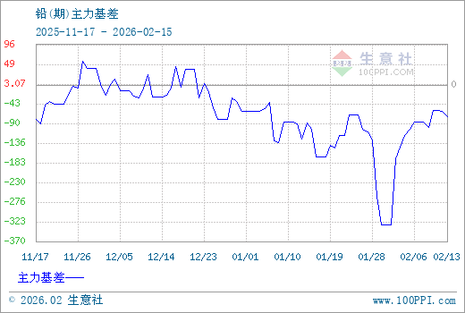 1、从2025-11-17 至 2026-02-15期间,铅主力基差最大值为57.50,最小值为-331.25,平均值为-65.56。2、主力基差 = 现货价格 - 主力期货价格 = 主现期差。